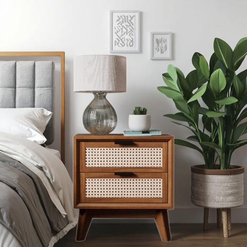 Atacado Preto Nightstand Rattan De Madeira Sólida Bastão Tecido Moderna Boho Mesa De Cabeceira para Quarto