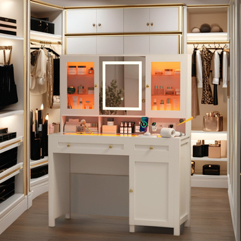 Modern kızlar beyaz soyunma Vanity masa masa seti işık çok depolama çekmeceler cam üst ayna yatak odası paneli ahşap soyunma tablo